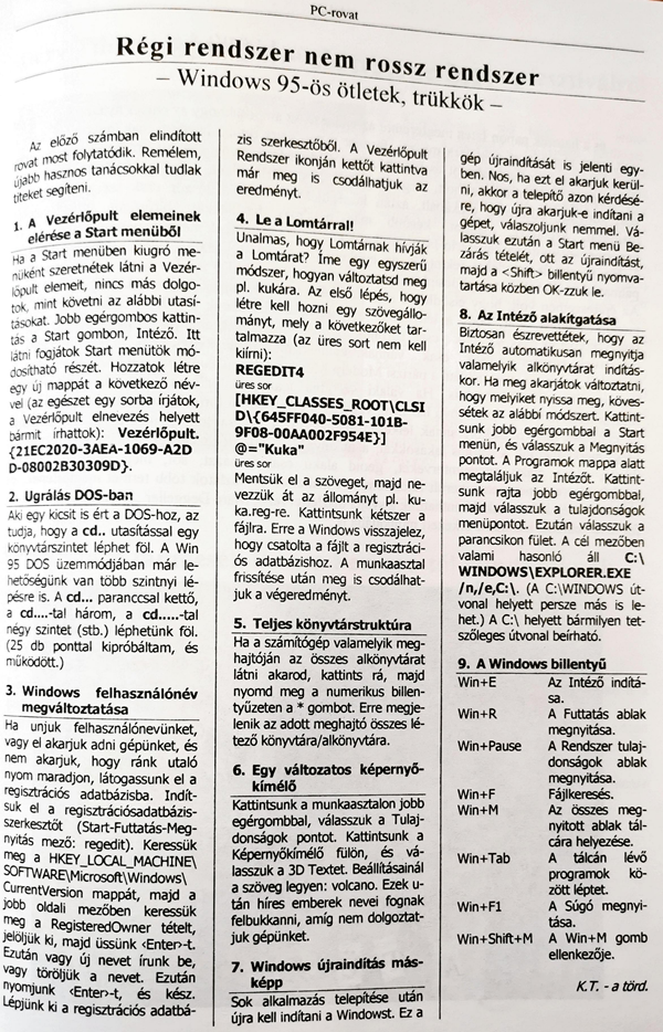 A Toldy Ferenc Gimnázium hivatalos iskolaújságjában, az „aLap” XXVII. évfolyamának 3. számában (1999. január-február) jelent meg az alább közölt cikkrészlet. Meglepő, hogy ezek közül mennyi praktika még ma is hasznosítható. (Bár én már szórakozásból nem piszkálnám a regeditet.) Mégis, szerintem annak bírhat igazán nosztalgikus élménnyel, akinek még volt szerencséje legalább Windows XP-t használni (ha nem korábbi operációs rendszert). Ha valaki az eredeti formájában kíváncsi a cikkre, tekerjen az oldal aljára.:
