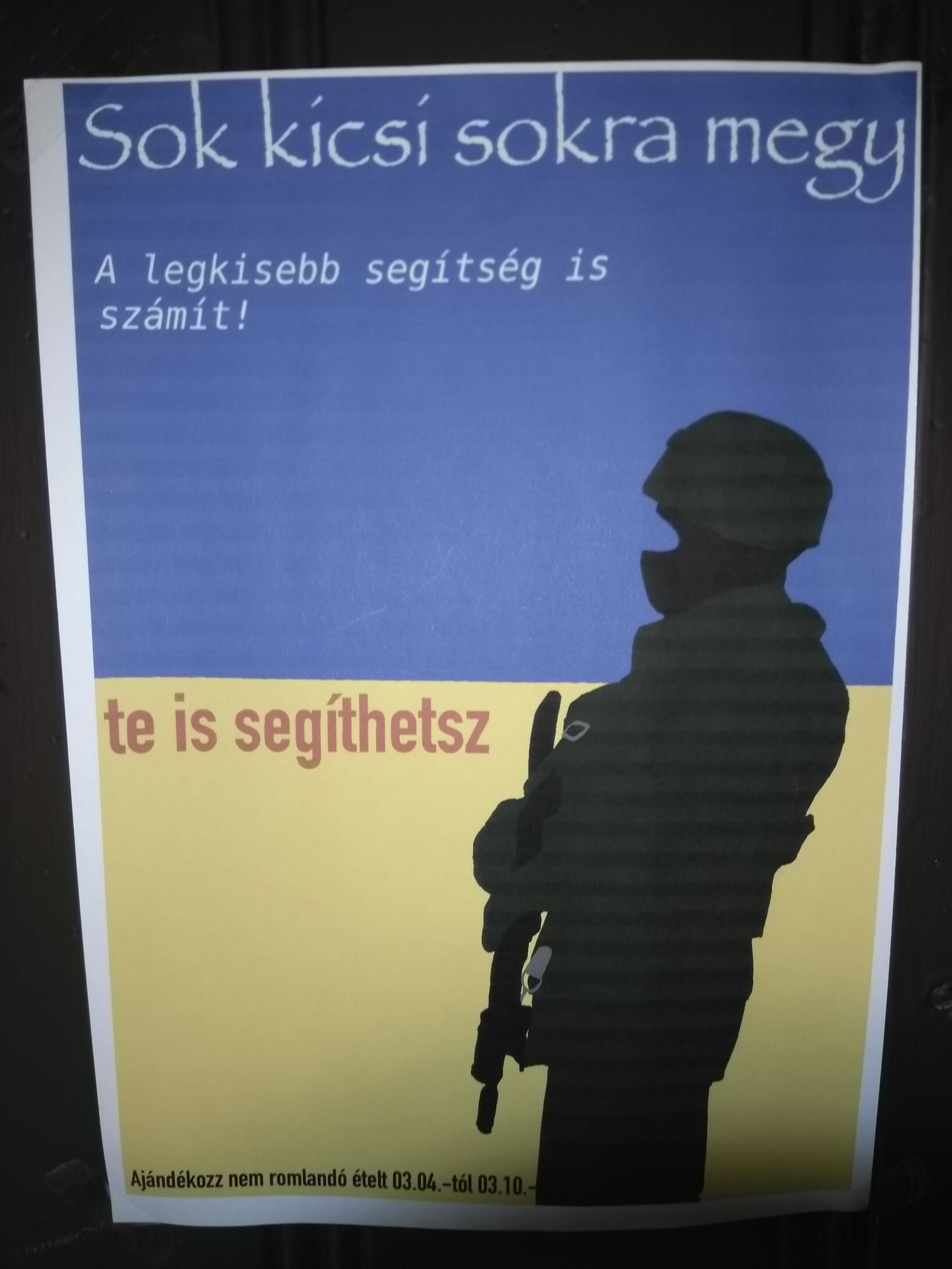 A plakáton az ukrán zászló színei előtt álló katona sziluettje látható, ami az A4-es lap magasságának mintegy négyötödét teszi ki. Mellette a "te is segíthetsz" felirat, majd az oldal alján apró betűkkel, szinte eldugva a tartós élelmiszer adományozására buzdító sor. Igaz ugyan, hogy a plakát tetején megjelenő sorok többé-kevésbé az anyagi támogatásra utalnak, de mégis, ilyen módon a hirdetés megjelenése markánsan militáns, engem és még jó néhány iskolatársamat leginkább egy toborzóplakátra emlékeztet.