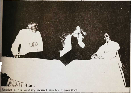 A második a nyelvi műsorok. Általában - legalábbis a tanárok számára - ezek szokták a keretet adni a TDN-nek, ellenben egyre jobban elegük van abból, hogy kizárólag az ő feladatukká vált a műsorok előkészítése, betanítása. Mintha a diákokat ez nem izgatná. Ez pedig a műsorok nézettségét figyelembe véve nem túl valószínű, vagy csupán az előtte való készülés nyűgös nekik? A tanárok kritikus pontnak érzik a nyelvi műsorokat, és valljuk be, azok is. Némi fantáziával el lehet képzelni, mi lenne, ha a tanárok kiszállnának először a nyelvi műsorokból, aztán szépen lassan az összes többiből. Lehet, hogy nem maradna más, csak a Sportdélelőtt - az is délután...
