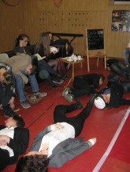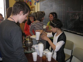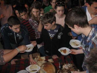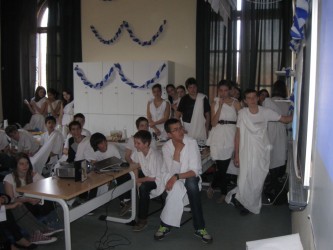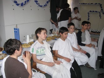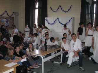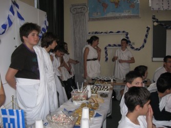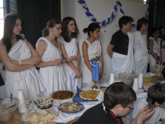 Aki ezek után még éhes maradt, átmehetett az 1.a-sok Görögországjába. Itt volt finomság bőven, ehettünk fetát, görög salit, mézes joghurtot, sőt még görög sütiket is kínáltak a fehér lepelbe öltözött diákok.