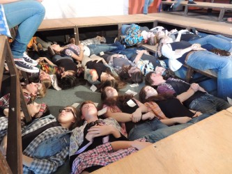 Több éves tapasztalat alapján mondom, hogy a főpróba-időszak alatt mindenki átlendül a maga holtpontján. Ilyenkor kimerültek, nyugtalanok, türelmetlenek vagyunk. Bár kétségtelenül ekkor csiszolódunk össze és válunk csapattá. Még a próbák után is bent maradtunk és arról beszélgettünk, hogy miért idén, és miért épp ezt a darabot adjuk elő, ki miért akarta színpadra vinni, kinek mit jelent, és mi az üzenete? Természetesen nem lehetett „jó válasz”. :-)