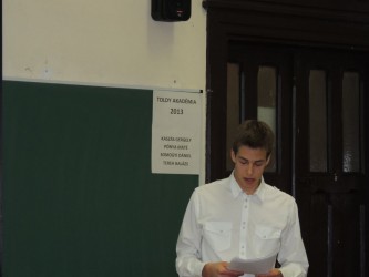 A Toldy Akadémia 2013. évi ülését március 14-én, csütörtök délután tartottuk meg. A zsűri elnöke idén is Dr Alföldy Ferenc, iskolánk egykori diákja, Állami-díjas orvosprofesszor volt. A tekintélyes zsűri tagjai voltak: Wakai Seiji, a Károli Gáspár Református Egyetem Bölcsészettudományi Karának tanára, a Japanológia Tanszék munkatársa, Dr Számvéber Norbert őrnagy, hadtörténész, a Hadtörténeti Intézet és Múzeum munkatársa, levéltárvezető, Porogi András, iskolánk igazgatója, továbbá Kerkovits Nóra Melinda, a 2011. évi akadémiai ülés közönségdíjas előadója.