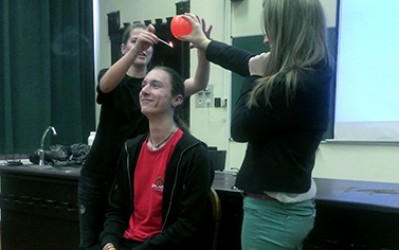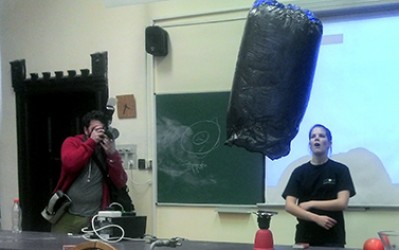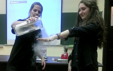 A rövid biológia óra után a Csodák Palotája két munkatársa egy lendületes, színes bemutatóval állt elő. A látványos kísérletek folyékony nitrogénnel, gázokkal-lángokkal, műanyagpalack-bombákkal nagyon szórakoztatóak voltak, némelyiknél mi is bekapcsolódhattunk. Ha valakit érdekel, de lemaradt róla, vagy csak szeretné újra megnézni, erre van lehetősége ide kattintva.