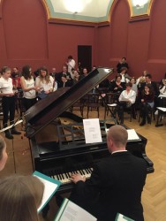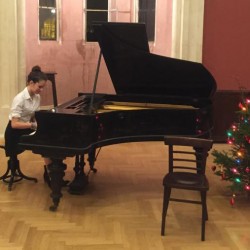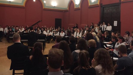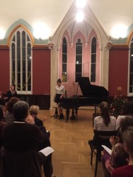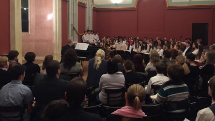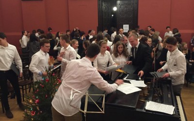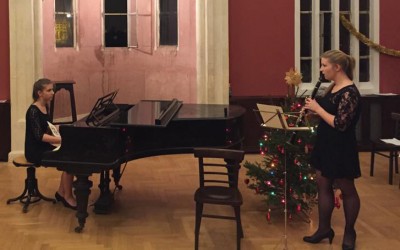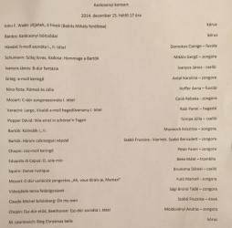 Miután mindenki elhelyezkedett az ünnepi hangulatú díszteremben, a kórus megnyitotta a koncertet John F. Wade Jöjjetek, ó hívek, majd Bárdos Lajos Karácsonyi bölcsődal című művével. Ezután következtek a különféle hangszeres művek; fuvola-, zongora-, cselló-, hegedű-, sőt még trombitajáték is elhangzott, többek között Bartók-, Mozart- és Chopin-műveket hallhattunk a lelkes és különösen tehetséges diákok előadásában.