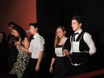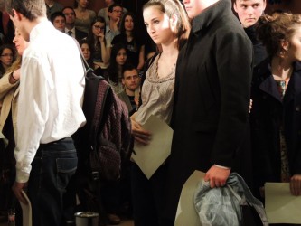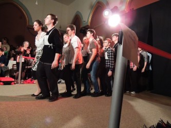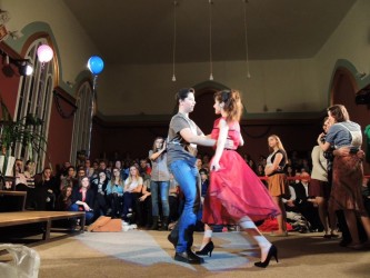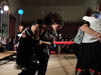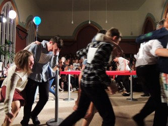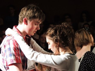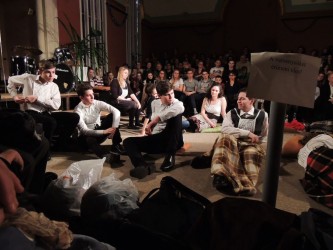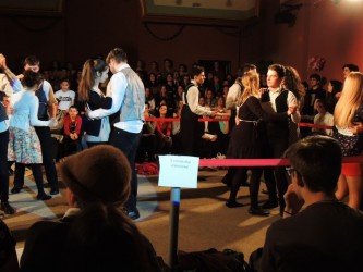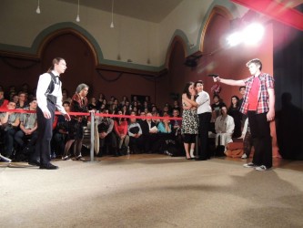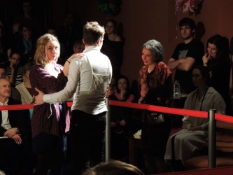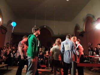 Majd másnap már élesben ment az egész. A teátristák fél 6 körül elkezdtek gyülekezni a hátsó teremben, majd jött a készülődés, egy órával később pedig elkezdtek szállingózni az első nézők is. Aztán 7 után nem sokkal izgatottan álltunk a függöny mögött arra várva, hogy kialudjanak a fények, és elkezdődjön a maratoni táncverseny. Kétszer egy óra kemény tánc… Folyamatos fáradás… De bírjuk… Mert muszáj… És a történet egyre izgalmasabb lesz… A végén lesz gyilkosság… És happy end is… És rengeteg kérdés marad… A nézőkben és bennünk is… Még ennyi előadás után is. De azt szokták mondani, hogy az a jó előadás, amin muszáj gondolkodni még azután is, hogy kijöttünk a nézőtérről.