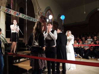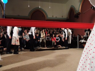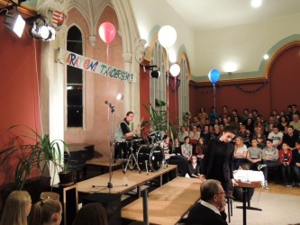 Kellemes meglepetést okozott számunkra a díszterem átrendezése, ami ez által két, egymással szemben lévő nézőtérre oszlott, középen a színpaddal/táncparkettel.
