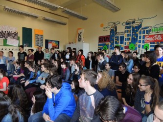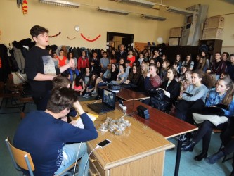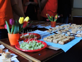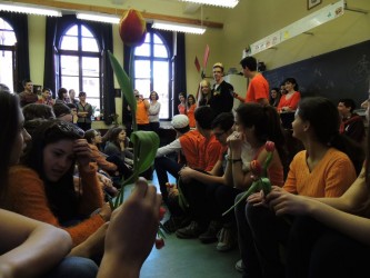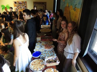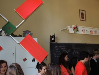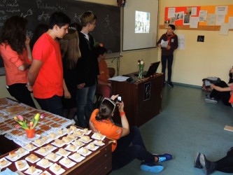 A 3.b osztály Hollandiát igen látványos, egyedi módon mutatta be; ahogy beléptünk az ajtón, tulipánokkal borított terem tárult a szemünk elé, illetve minden tanuló egy narancssárga ruhadarabot viselt, ami az uralkodóházat szimbolizálta. Elsőként egy fiú és egy lány tanuló, király és királynéként mutatkozott be, és üdvözölték a nézőket hollandul. Ezután a hollandok biciklikultúrájáról hallhattunk előadást, majd az ország művészi hátterét bemutatva híres festőkről meséltek a tanulók. A terem egyik pontján holland specialitásokat lehetett megkóstolni, illetve tehéntejet inni, melyet egy tehénnek öltözött diák kínált fel.