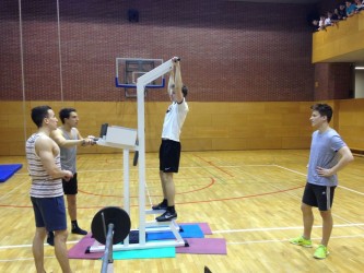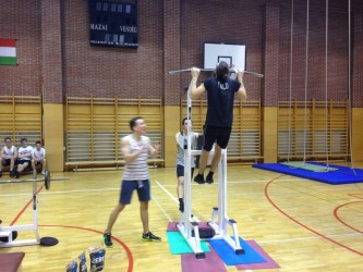 Mindenre elszánt versenyzőinkkel 13 órakor kezdtük a bemelegítést a tornacsarnokban. Tíz perccel később, amikor mindenki ízületei és izmai megfelelően bemelegedtek, már indult is a megmérettetés. Mindenki remekül teljesített, így nagyon szoros verseny alakult ki. A hangulat fergeteges volt, a nézősereg a lelátón tombolt, tovább emelve a versenyzők adrenalin-szintjét. Az első versenyszám a függeszkedés volt, ez bizonyult a legnehezebb feladatnak, ugyanis ülésből indulva, kizárólag a karok és a hát erejével, lábak használata nélkül kellett időre feljutni a kötél tetejére, majd minél gyorsabban lemászni. A fekve nyomás szintén komoly megmérettetés volt. Testtömegtől függően különböző nehézségű súlyokat kellett kinyomni. Mivel már a 40 kg-os súly veszélyes lehet a gyakorlatlanok számára, a szervezők a rúd két oldalán állva vigyáztak a versenyzők biztonságára. Ezt követte az utolsó versenyszám, a húzódzkodás. Mindenki a maradék erejét összeszedve, hősiesen küzdött a végső összecsapásban.
