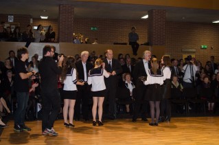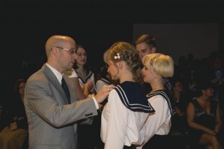 18:00 órára mindenki megérkezett, és az igazgató úr megnyitó beszéde után szalagtűzés is megkezdődött. Először a 6.a-sok, majd a b-sek vonultak be osztályfőnökeik és osztályfőnök-helyetteseik kíséretében, akik feltűzték a sötétkék szalagokat, amelyeken a gimnázium neve és a végzősök első és utolsó tanévének a dátuma látható.