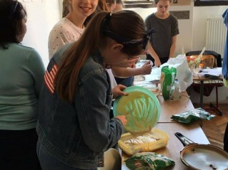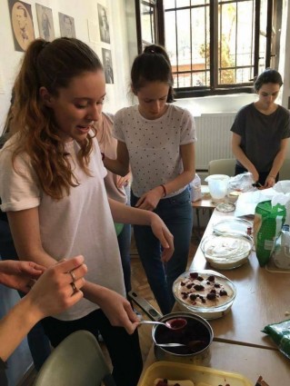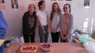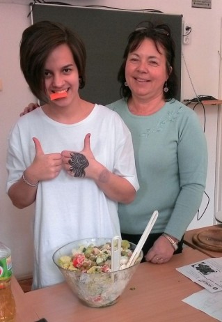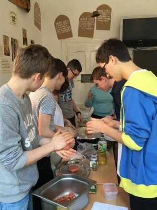 A később érkezők láthatták, amint a kicsit sem halk és nagyon lelkes csapat kétféle salátát, shepherd's pie-t (pásztorpitét), kínai tésztát, húspogácsákat, krumplipürét és gyümölcsös tiramisut próbál gusztusos formában elkészíteni.