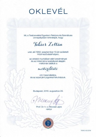 2016. január elsejétől mesterpedagógusi fokozatba minősítették.