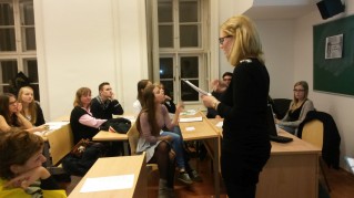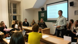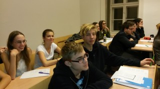 Bevezetésképp a germanisztika tanszék tanulói tartottak egy német nyelvű prezentációt a műfordításról általánosságban, utána pedig megkezdődött a program interaktív része, ahol egy konkrét mű fordításával foglalkoztunk. A diákok már előzetesen felkészülve látogattak el az előadásra, Johannes Becher: Luther című művének egy részét fordították le. Az interaktív részben főként erről volt szó. Az előadókkal közösen megvitattuk a művek fordításának, értelmezésének nehézségeit, módjait. Számtalan érdekes kérdés merült fel a témával kapcsolatban, mint például: Kell-e a rímeket tartani? Mennyire kell a költői eszközöket figyelembe venni? Hogy lehet olyan szavakat lefordítani, amiket nem találunk a szótárban?