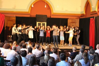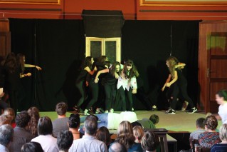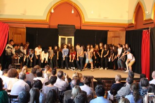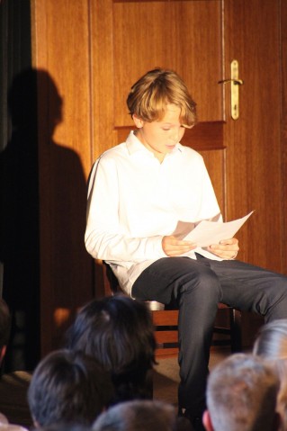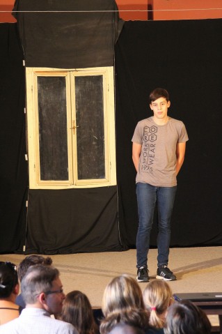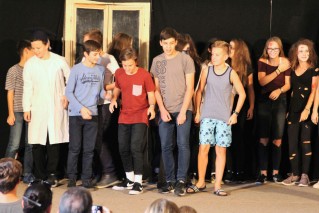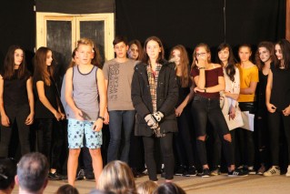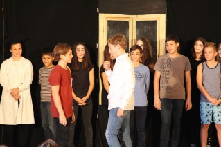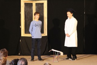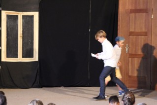 Mikor mindenki készen állt, elindultunk a helyszínre, utunk a díszterembe vezetett. Az a-sok előadásával, pontosabban vetítésével kezdődött a műsor. Ez igazán frappáns volt, mindenki élvezte. Ezután a mi színdarabunk került sorra, mi lepődtünk meg leginkább, hogy ilyen jól sikerült. A végén sok örömet és nevetést okozott oklevélosztásunk.