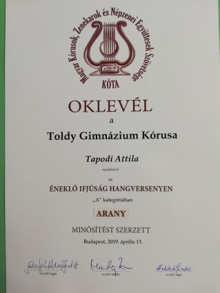 A Magyar Kórusok, Zenekarok és Népzenei Együttesek Szövetsége - KÓTA által szervezett budapesti központi minősítő hangversenyen a Toldy kórusa az "A" kategóriában érdemelte ki az elismerést.