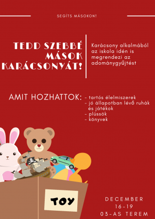 A téli szünet előtti utolsó héten a tavalyiakhoz hasonlóan várjuk a különböző adományokat, melyeket a MikulásGyárnak fogunk továbbítani. Tartós élelmiszereket, jó állapotban lévő ruhákat és játékokat, plüssöket, valamint könyveket hozhattok. Az ajándékokat az 5. b osztálytermében (03) tudjátok leadni a hét folyamán.
