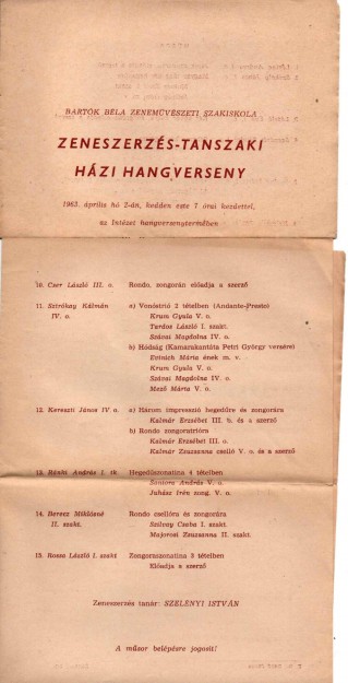 - Meghívó és műsor: Bartók Béla Zeneművészeti Szakiskola, Zeneszerzés-tanszaki házi hangverseny, 1963. április 2.