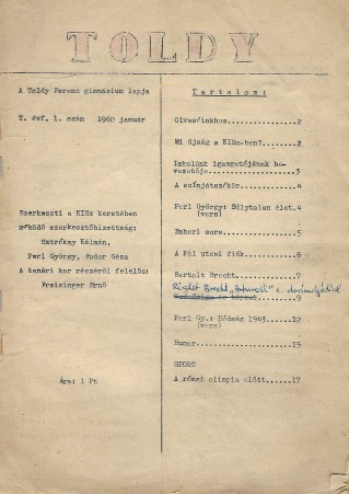 - Toldy, A Toldy Ferenc Gimnázium lapja, 1960. 1. (január), címlap