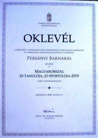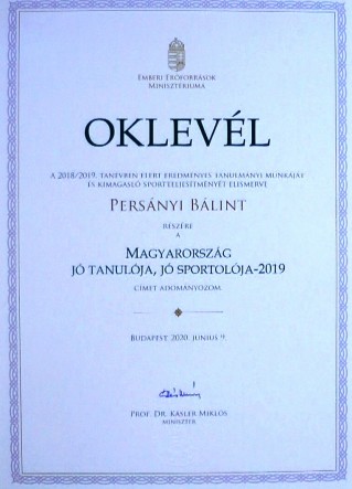 Persányi Barnabás (3. a) és testvére, Bálint - aki szeptembertől lesz a Toldy tanulója - is átvehette a Dr. Kásler Miklós, az emberi erőforrások minisztere által kibocsátott oklevelet.