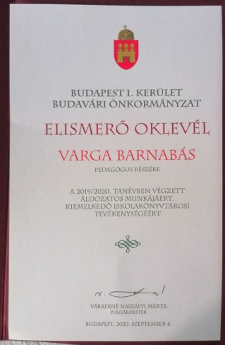 Tizennyolc éve, 2002 óta a Toldy Gimnázium tanára. Az első években latint tanított, az utóbbi évtizedben pedig az iskola könyvtárosa. Ékes példája annak, hogy az iskolai könyvtáros igazi nevelő munkát végez. Tanár és diák egyaránt mindig bizalommal fordulhat hozzá, mindig segítséggel és útmutatással szolgál. A könyvtár az iskola kitüntetett helye, kis elíziuma, ahol barátságos környezetben nyugodtan dolgozhat a betérő. Varga tanár úr ezen kívül az iskola tanórán kívüli tevékenységeinek is motorja, szabadidős programok, kirándulások, táborok szervezésében, lebonyolításában vezető szerepet visz.