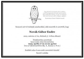 Novák Gábor búcsúztatását 2023. április 27-én 10:45 perckor tartják az Újköztemetőben (Bp. X., Kozma u. 8-10.).