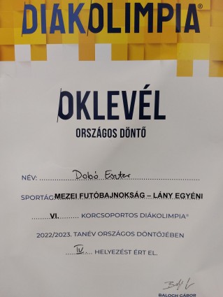 A versenyen iskolánk végzős tanulója, Dobó Eszter (12. a) korcsoportjában kiváló futással a nagyszerű negyedik helyet szerezte meg több mint száz vetélytársa közül!