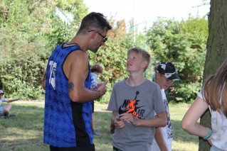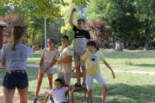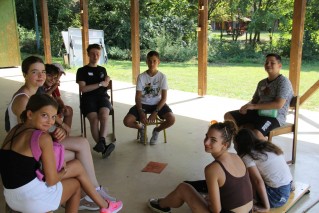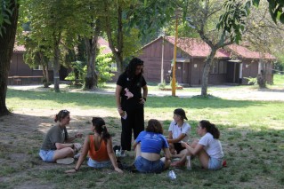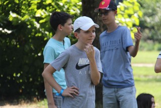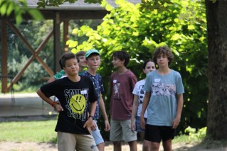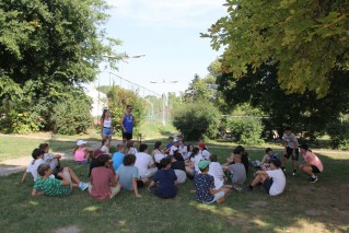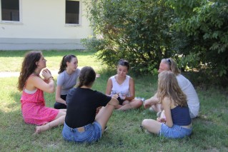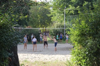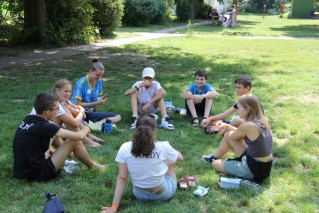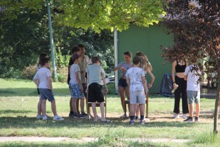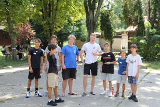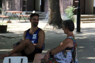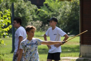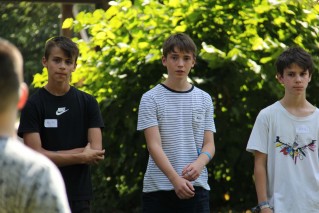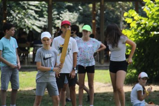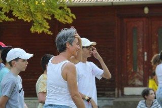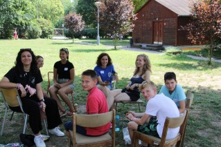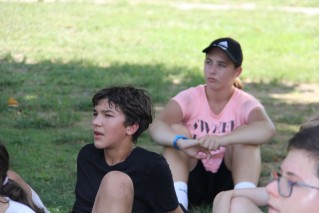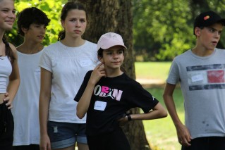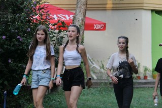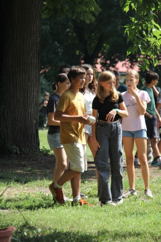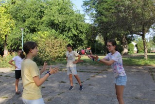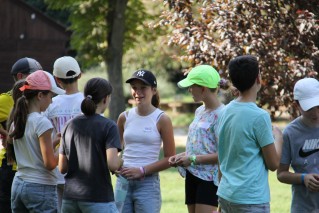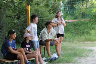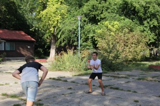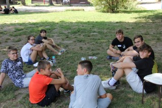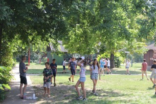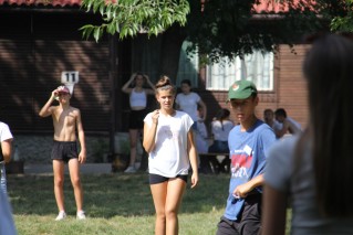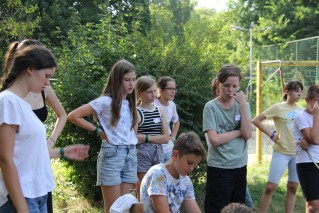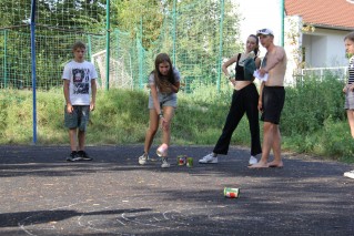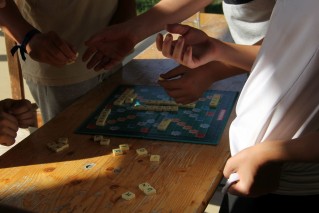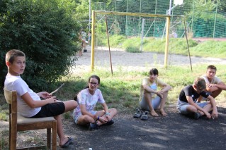 Ezután vetélkedő következik: indiánról indiánra járjuk az állomásokat. Egyszer kéz nélkül gurulunk bokortól bokorig, máskor ping-pong labdával célzunk pohárba. Már most csurom víz mindenki és csupa sár, pedig még hátra van jó pár feladat. Például spéci zsinórlabda vizes-homokos szivaccsal a röpipályán. Aztán szoborba kell állnunk, mintha mi lennénk a golyózó Pál utcai fiúk, majd minél viccesebb szavakat kirakni a Scrabble-ben. A Netfit fekvőtámasz már kevésbé szórakoztató, de így is nagyon jól érezzük magunkat.