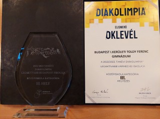 Az eseményen Balatoni Katalin köznevelési helyettes államtitkár tartott beszédet, gratulált a diákolimpiákon részt vett több mint 17 ezer diáknak, majd díjakat adott át Balogh Gábor, világbajnok öttusázó, a Magyar Diáksport Szövetség és Varga András, a BDSZ elnöke, valamint Hamar Pál, a Testnevelő Tanárok Országos Egyesülete elnökének társaságában. Elismerésben részesültek a diákolimpiák egyéni bajnokai, aranyérmes csapatai, valamint felkészítő tanáraik, valamint a legaktívabb iskolák. Köztük a Toldy, hiszen a 2022/23-as budapesti diákolimpiai versenyrendszerben a középiskolák között gimnáziumunk a harmadik legaktívabbnak bizonyult (a Csanádi Árpád Sportiskola, valamint a Verebély László Technikum mögött)! Az oklevél és az üveg plakett mellett 80 000 forint jutalomban részesültünk.
