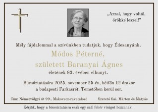 Ezúton tudatjuk mindenkivel, akik szerették és tisztelték, hogy a Toldy Gimnázium egykori tanára, szeretett kollégánk, Módos Péterné Ágnes végső búcsúztatása 2024. november 25-én, hétfőn 12.00 órakor lesz a Farkasréti temető Makovecz-ravatalozójában, katolikus szertartás szerint.