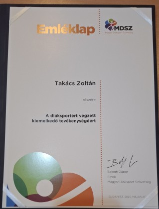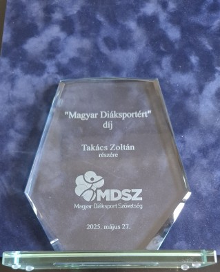 A Magyar Diáksport Szövetség (MDSZ) május 27-i küldöttgyűlésén adták át a Diáksportért díjakat. Minden vármegyéből egy-egy, valamint Budapestről 2 testnevelő tanár, köztük Takács Zoltán tanár úr részesült az elismerésben a diáksport területén hosszú éveken át végzett kiemelkedő munkájáért. A díjakat Balogh Gábor az MDSZ elnöke, valamint Tóth Zoltán alelnök adták át.