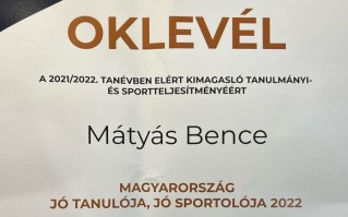 Bence (7. a) megkapta a Magyarország jó tanulója, jó sportolója díjat.