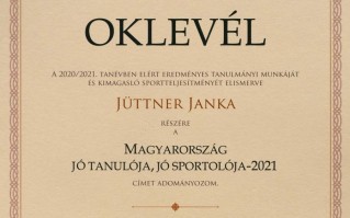 Jüttner Janka (9. a) megkapta a Magyarország Jó tanulója, jó sportolója díjat.